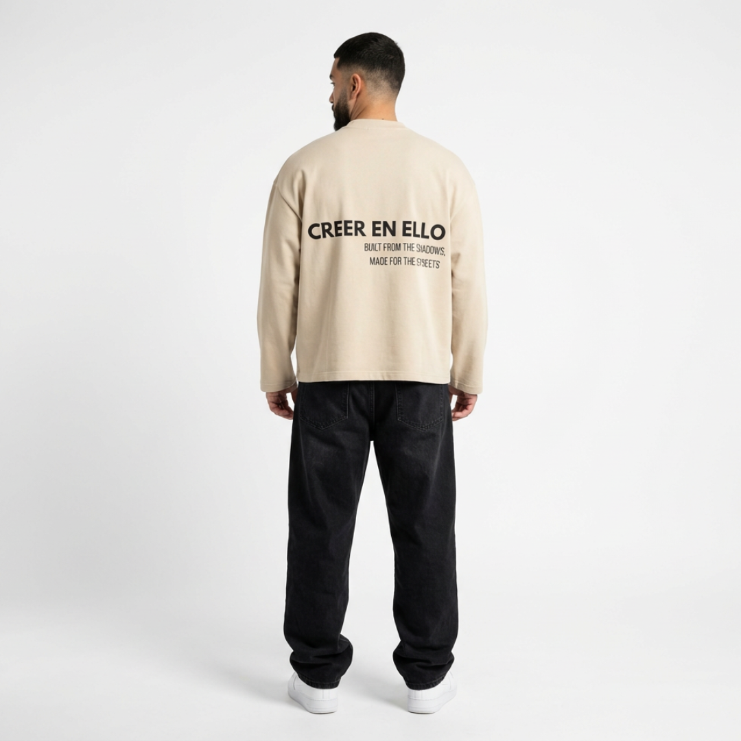 Featuring a minimal front print and a bold back statement “Built in the shadows, made for the streets”, this piece tells a story of silent growth and visible strength. Clean on the front, powerful on the back — exactly what CREER EN ELLO stands for.